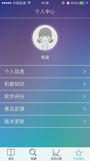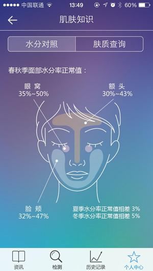个人中心界面可以输入和修改个人信息。如果用户填写信息时不清楚肤质属性,在肌肤知识中能够找到肤质查询,根据肤质描述定位自己的肤质类型。软件评分和意见反馈也设置在此处,用户能够随时填写对美立知的建议。美立知在软件体验方面考虑的非常周全,无论是美容小白还是资深美容咖,都能根据需求查到贴心的肌肤知识和资讯。比如水分对照图分季节呈现了脸部各部位的正常值范围,为用户测量结果提供更准确的参考值,但是没有手部的水分对照表,有待增加。