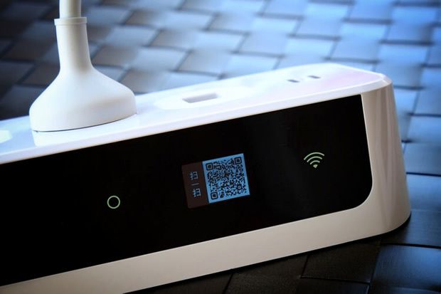 这时微插座上的屏幕会同步显示出一个二维码,这也是之前提到过的这块屏幕的特殊用途。这个二维码,并不是包装上所印的那个。包装上的二维码只是关注公众账号,而屏幕上显示的,则是要用于将插座与微信进行配对绑定。出于安全性考虑,这个二维码是随机生成的,所以没有采用纸质印刷的形式体现。如果在一段时间内没有完成扫描绑定,屏幕会自动切换为时钟状态,再次获取可以通过点击面板上的Wifi按钮来进行切换。